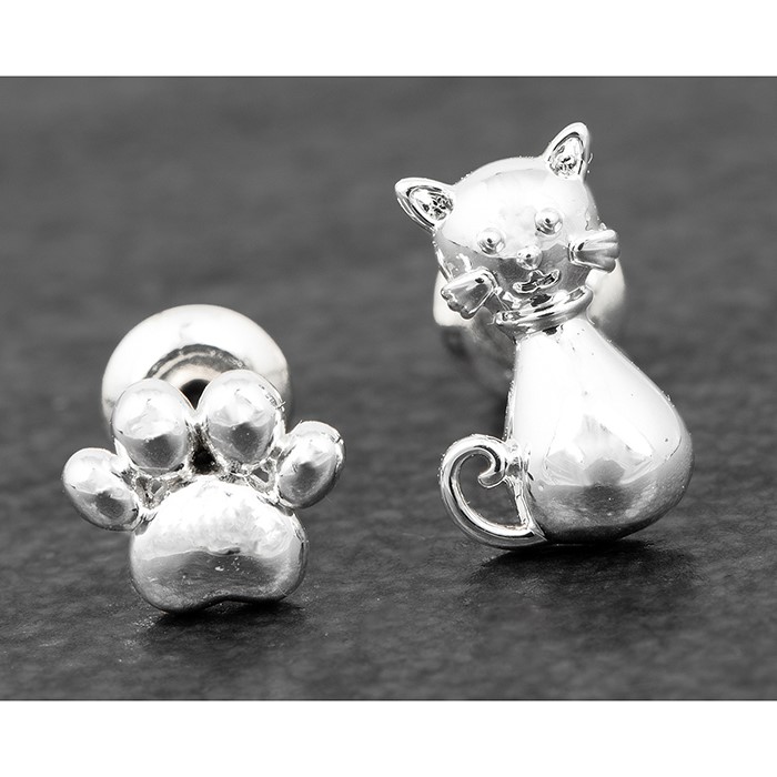 Cat & Paw Print Odd Silver Plated Earrings